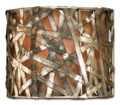 This fabulous wall sconce design offers distinctive styling. Silver leaf finished metal strips strike a kinetic pattern up front. An antique stain add drama. A champagne fabric inner shade promises warm illumination. A great choice for updated decors. From the Uttermost Alita lighting collection.