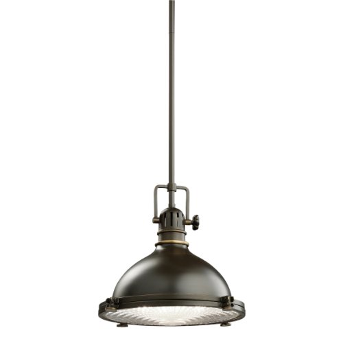 This striking pendant light offers an industrial chic lighting addition to your decor. The look is no-nonsense with crisp, clean lines. This stylish Kichler pendant light features an olde bronze finish and a Fresnel lens.