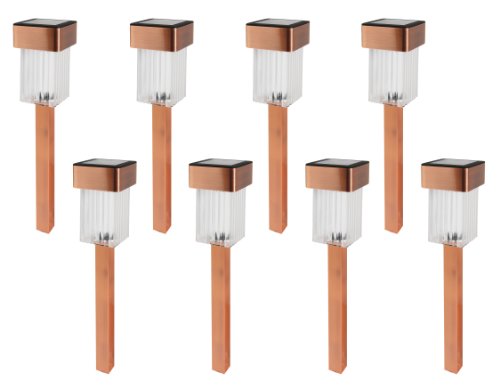 Brinkmann's Solar Mini Stake Lights are the perfect solution for lighting paths and entryways. Not only are these lights bright enough to illuminate most dark spaces, they're a tremendous value. Finished in copper with an elegantly squared design, these are sure to stand out. Set includes 8 lights.